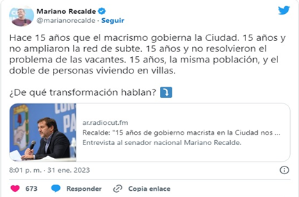 “Larreta hace el anuncio desde Villa Soldati, donde creció la mortalidad infantil. 6,6 muertes cada mil nacimientos, casi el triple que en el norte de la Ciudad” escribió el senador peronista en su cuenta de Twitter como respuesta al anuncio. “En el sur los niños y niñas nacen con menos posibilidades de vida. Son 15 años de macrismo y desigualdad”, agregó Recalde.